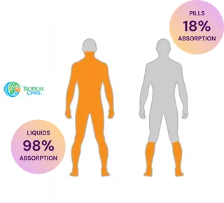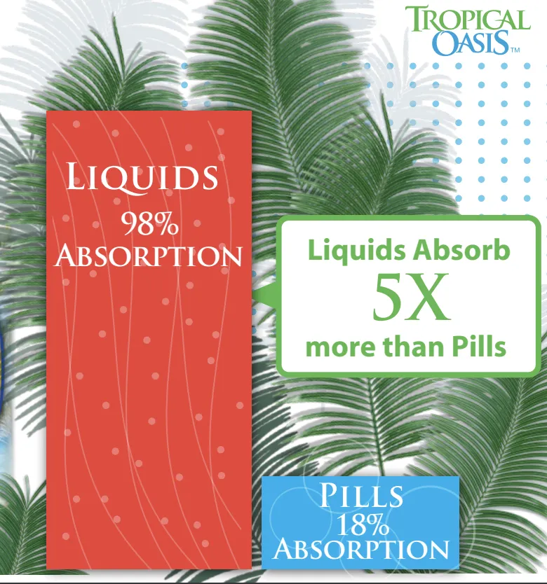Liquids do not have to be digested, broken down in the stomach by acids and enzymes, like pills do. Hence, liquids are absorbed faster and more completely than pills.