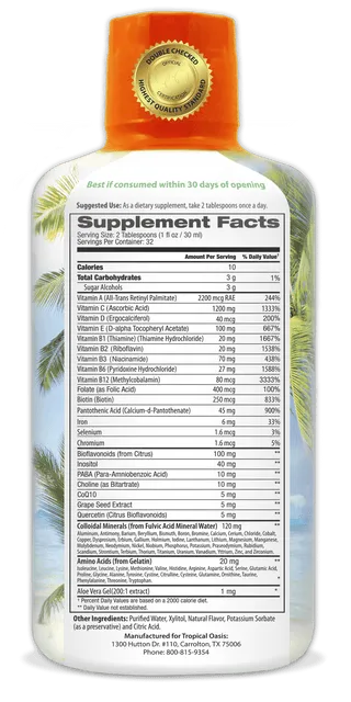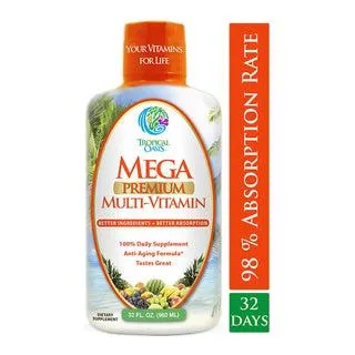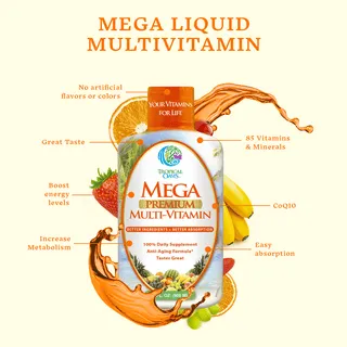 Tropical Oasis Mega Premium Multivitamin is a liquid dietary supplement formulated with over 30 essential vitamins and minerals designed to support overall health, energy levels, and immune function. It provides comprehensive nutritional support in an easy-to-absorb liquid form.