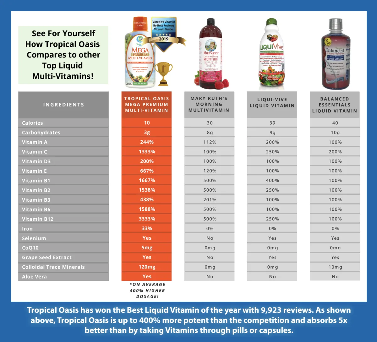 The liquid form of Tropical Oasis Mega Premium Multivitamin allows for better absorption of nutrients compared to traditional pills. Many users find it more convenient and easier to take, especially for those who struggle with swallowing pills.